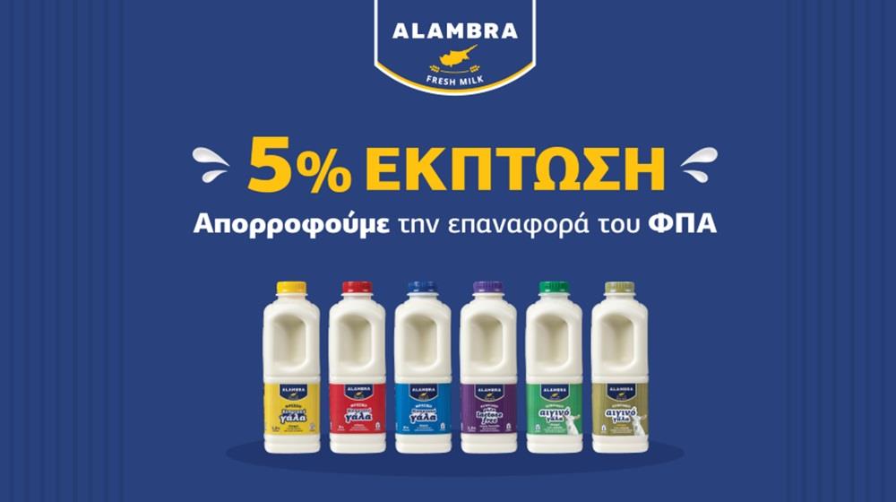 Αποδεικνύοντας έμπρακτα την εκτίμησή της στη διαχρονική εμπιστοσύνη που ο Κύπριος καταναλωτής δείχνει στα ποιοτικά αγνά προϊόντα της, η Γαλακτοβιομηχανία Αλάμπρα, στέκεται για άλλη μια φορά δίπλα του, απορροφώντας το 5% που επιφέρει στην τελική τιμή η επαναφορά του ΦΠΑ στο Φρέσκο Γάλα.