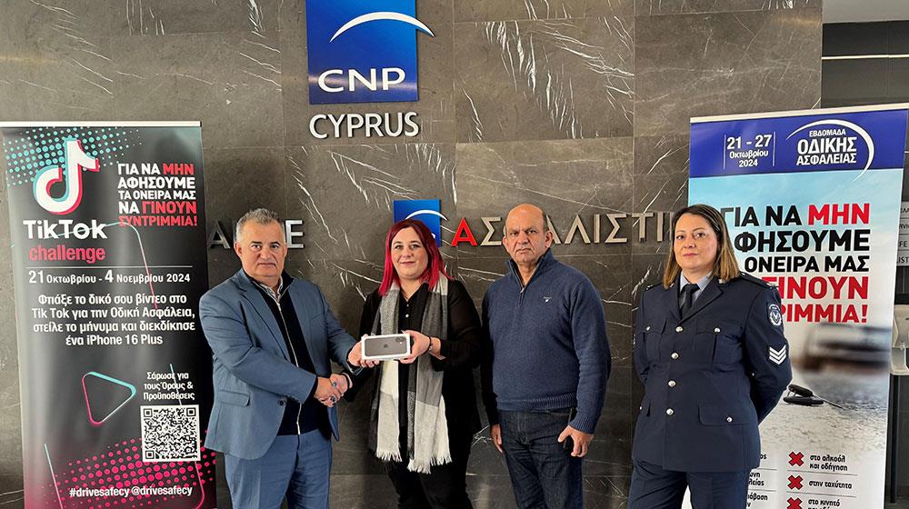 Η νικήτρια έχει βραβευτεί με ένα iPhone 16 Plus. Το βραβείο απένειμαν ο κύριος Χάρης Ν. Παστίδης, Διευθυντής Πωλήσεων & Στήριξης Εργασιών CNP ΑΣΦΑΛΙΣΤΙΚΗ, ο κύριος Ιωάννης Μαυρόχαννας, Αστυνομικός Διευθυντής Τμήματος Τροχαίας Αρχηγείου Αστυνομίας Κύπρου και η κυρία Χριστιάνα Στεφανίδη, Λοχίας Γραφείου Πρόληψης και Διαφώτισης του Τμήματος Τροχαίας Αρχηγείου Αστυνομίας Κύπρου.