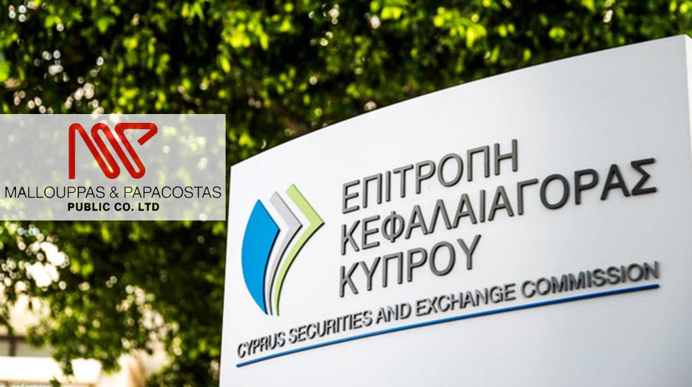 Το αίτημα των προτεινόντων για εξάσκηση του δικαιώματος εξαγοράς (Squeeze Out) για την απόκτηση του 100% των μετοχών της Mallouppas & Papacostas Public Co Limited, το οποίο υπεβλήθη από τους Πόλυ Μαλλούππα, Λίζας Μαλλούππα, Ανδρέα Μαλλούππα, Μαρίας Μαλλούππα, Κώστα Παπακώστα και Χρυστάλλας Παπακώστα, ενέκρινε η Επιτροπή Κεφαλαιαγοράς Κύπρου.