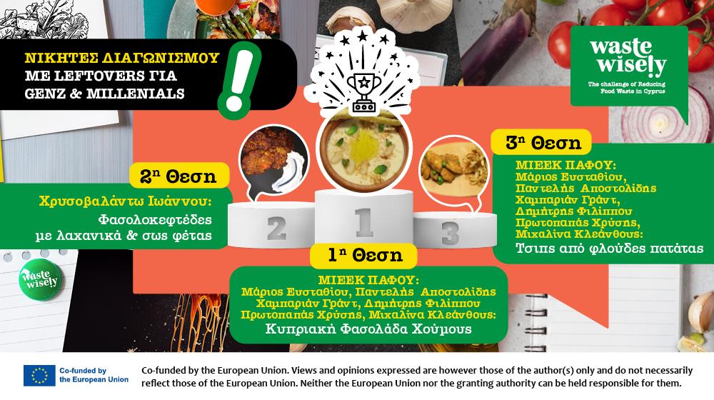 Με επιτυχία ολοκληρώθηκε ο πρώτος διαγωνισμός "Συνταγών με περισσεύματα τροφίμων (leftovers) για άτομα Gen Z και Millennials", μια πρωτοβουλία που αποσκοπούσε στην προώθηση της δημιουργικής χρήσης των leftovers στη μαγειρική στο πλαίσιο του ευρωπαϊκού έργου Waste Wisely Cyprus.