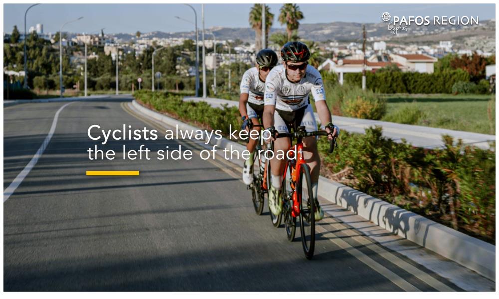 Για τρίτη συνεχή χρονιά η Εταιρεία Τουριστικής Ανάπτυξης και Προβολής Περιφέρειας Πάφου με τη στήριξη των ποδηλατικών ομίλων Πάφου και Ευαγόρα Παλληκαρίδη διεκπεραιώνουν αυτή την περίοδο εκστρατεία με τίτλο “Ας μοιραστούμε τους δρόμους με ασφάλεια” - Let’s share our roads safely.
