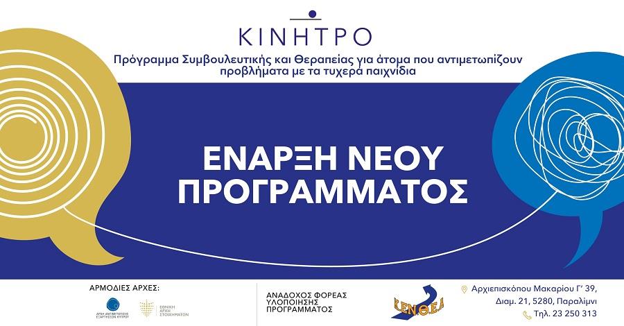 Η Εθνική Αρχή Στοιχημάτων (ΕΑΣ) και η Αρχή Αντιμετώπισης Εξαρτήσεων Κύπρου (ΑΑΕΚ) ανακοινώνουν την έναρξη λειτουργίας του Θεραπευτικού Κέντρου «Κίνητρο» στην Επαρχία Αμμοχώστου και συγκεκριμένα στο Παραλίμνι, το οποίο απευθύνεται σε ενήλικες οι οποίοι παρουσιάζουν προβληματική ή παθολογική συμπεριφορά σε σχέση με την ενασχόληση τους με τα τυχερά παιχνίδια.