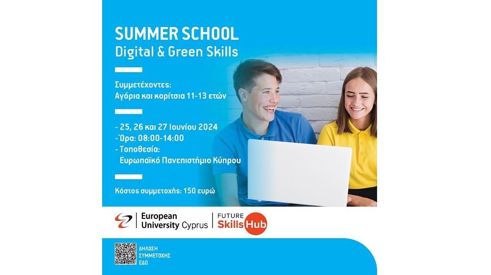 Το Future Skills Hub του Ευρωπαϊκού Πανεπιστημίου Κύπρου διοργανώνει το τριήμερο Digital & Green Skills Summer School, που έχει ως στόχο να βοηθήσει παιδιά ηλικίας 11 με 13 ετών να αναπτύξουν τις ψηφιακές και πράσινες τους δεξιότητες.