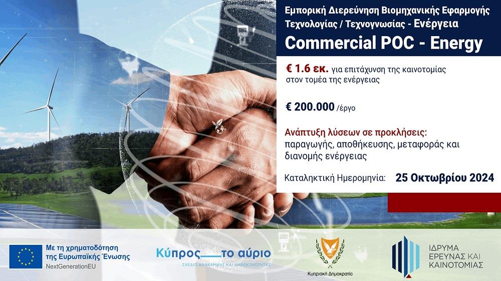 Το ΙδΕΚ ανακοινώνει το νέο χρηματοδοτικό πρόγραμμα «Εμπορική Διερεύνηση Βιομηχανικής Εφαρμογής Τεχνολογίας / Τεχνογνωσίας - Ενέργεια» με προϋπολογισμό €1,6 εκ. που στοχεύει στην επιτάχυνση της καινοτομίας στον τομέα της ενέργειας.