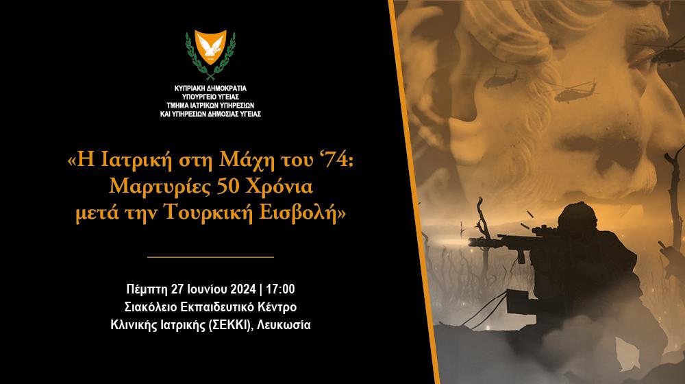 To Τμήμα Ιατρικών Υπηρεσιών και Υπηρεσιών Δημόσιας Υγείας πραγματοποιεί εκδήλωση με τίτλο «Η Ιατρική στη Μάχη του '74: Μαρτυρίες 50 Χρόνια μετά την Τουρκική Εισβολή», στις 27 Ιουνίου και η ώρα 17:00, στο Σιακόλειο Εκπαιδευτικό Κέντρο Κλινικής Ιατρικής (ΣΕΚΚΙ) στη Λευκωσία.