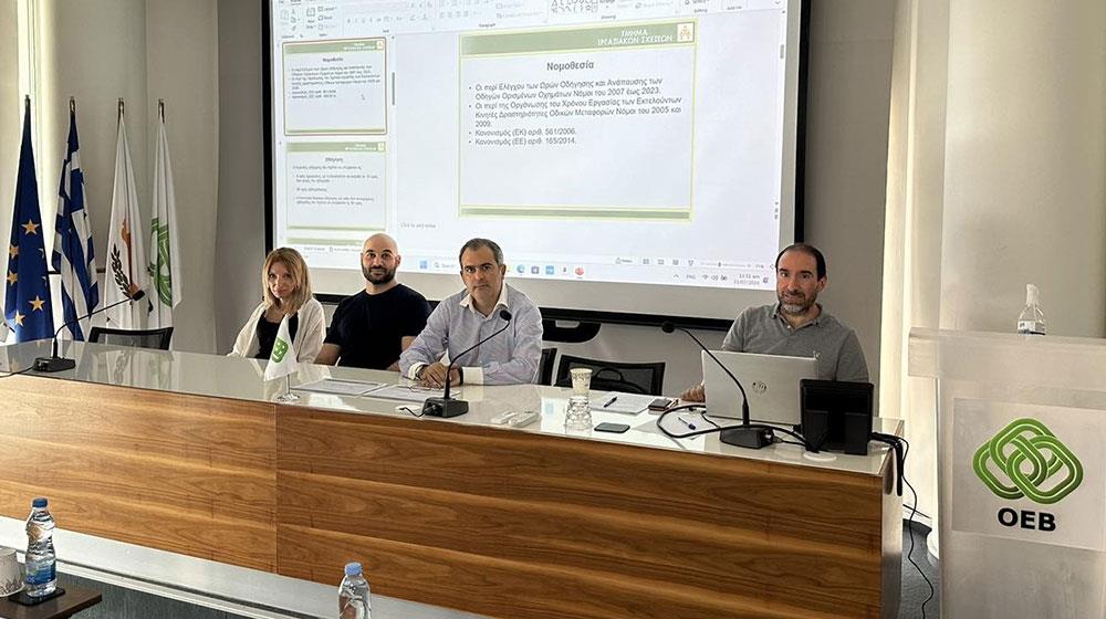 Η Ομοσπονδία Εργοδοτών & Βιομηχάνων (ΟΕΒ), σε συνεργασία με το Τμήμα Εργασιακών Σχέσεων του Υπουργείου Εργασίας και Κοινωνικών Ασφαλίσεων, πραγματοποίησε ενημερωτική ημερίδα στις 11 Ιουλίου 2024 στα γραφεία της ΟΕΒ, για επεξήγηση των προνοιών της νομοθεσίας για τις ώρες ανάπαυσης οδηγών λεωφορείων και φορτηγών (διαλείμματα, ημερήσια ανάπαυση, εβδομαδιαία ανάπαυση).