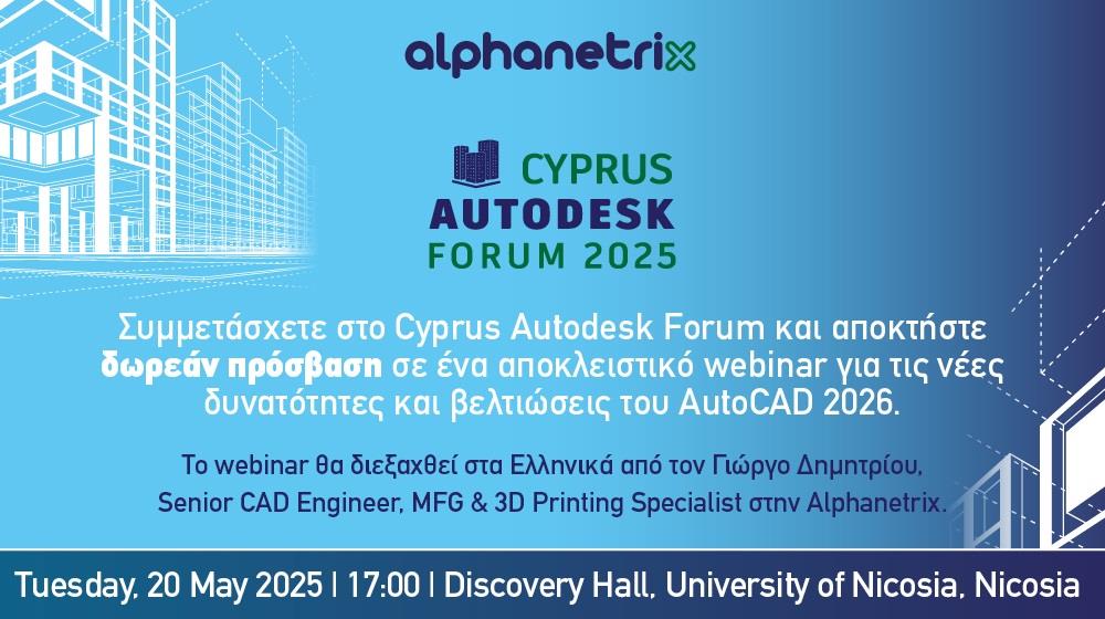 Η Alphanetrix προσφέρει στους συμμετέχοντες του πολυαναμενόμενου Cyprus Autodesk Forum 2025 μια μοναδική ευκαιρία για δωρεάν πρόσβαση σε ένα εξειδικευμένο webinar σχετικά με τις νέες δυνατότητες του AutoCAD 2026, το οποίο θα πραγματοποιηθεί στα ελληνικά, με εισηγητή τον Γιώργο Δημητρίου, Senior CAD Engineer, MFG & 3D Printing Specialist στην Alphanetrix.