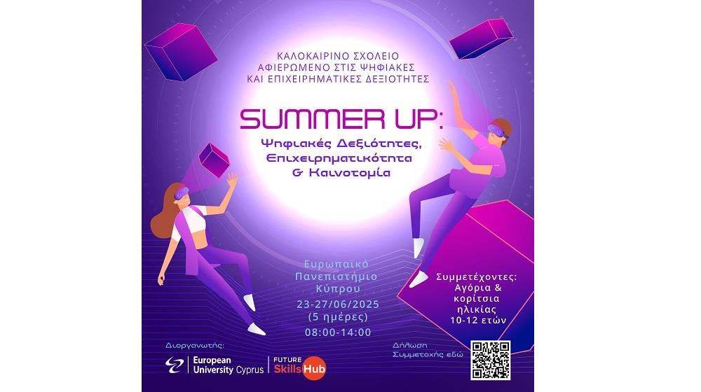 Το Future Skills Hub του Ευρωπαϊκού Πανεπιστημίου Κύπρου ανακοινώνει με χαρά τη διοργάνωση ενός καινοτόμου Καλοκαιρινού Σχολείου, ειδικά σχεδιασμένου για παιδιά ηλικίας 10–12 ετών, με τίτλο “SummerUP: Ψηφιακές Δεξιότητες, Επιχειρηματικότητα & Καινοτομία”.
