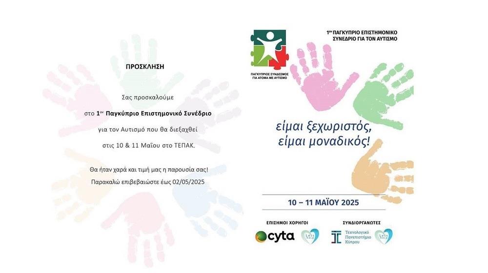 Ο Παγκύπριος Σύνδεσμος για Άτομα με Αυτισμό συνδιοργανώνει, σε συνεργασία με το Τεχνολογικό Πανεπιστήμιο Κύπρου και τον Μη Κερδοσκοπικό Οργανισμό LetsHelp και με την στήριξη της Cyta & LetsHelp, το 1οΕπιστημονικό Συνέδριο για τον Αυτισμό, στις 10- 11 Μαΐου στις εγκαταστάσεις του ΤΕΠΑΚ στη Λεμεσό.