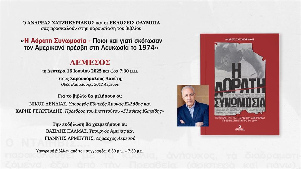 Το βιβλίο, που κυκλοφόρησε πρόσφατα από τις εκδόσεις Ολύμπια, είναι μια ιστορική έρευνα που φέρνει στο φως το ποιοι και γιατί δολοφόνησαν τον Αμερικανό πρέσβη στην Κύπρο τον Αύγουστο του 1974.