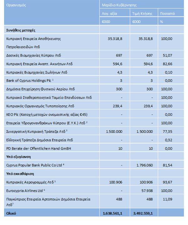 4 Τον Ιούλιο του 2012, στα πλαίσια της αναδοχής της έκδοσης δικαιωμάτων προτίμησης της τράπεζας Cyprus Popular Bank Public Co Ltd, η Κυβέρνηση απέκτησε το 84% του εκδοθέντος μετοχικού κεφαλαίου της τράπεζας. Ως αντίτιμο, εκδόθηκαν Κρατικά Ονομαστικά Χρεόγραφα αρχικής ονομαστικής αξίας €1.888.562.000 τα οποία παρουσιάζονται στον Πίνακα Δανεισμού (Πίνακας 4.1) της Δημοσιονομικής Έκθεσης. Σημειώνεται ότι το ποσοστό συμμετοχής της Κυβέρνησης μειώθηκε στο 81,5% μετά την έκδοση νέων μετοχών από την υποχρεωτική μετατροπή των Μετατρέψιμων Αξιόγραφων Ενισχυμένου Κεφαλαίου στις 4.2.2013. Τον Μάρτιο του 2013 η τράπεζα εισήλθε σε καθεστώς εξυγίανσης και με βάση το Περί της Πώλησης Ορισμένων Εργασιών της Cyprus Popular Bank Public Co Ltd Διάταγμα που εκδόθηκε στις 29.3.2013 και τα Διατάγματα που εκδόθηκαν στη συνέχεια, οι ασφαλισμένες καταθέσεις και η πλειοψηφία των περιουσιακών στοιχείων της τράπεζας μεταφέρθηκαν στην Τράπεζα Κύπρου Δημόσια Εταιρία Λτδ. Οι υποχρεώσεις που παρέμειναν στη Cyprus Popular Bank Public Co Ltd ξεπερνούν τα περιουσιακά της στοιχεία και άρα δεν αναμένεται να ανακτηθεί οποιοδήποτε μέρος της επένδυσης του κράτους στο μετοχικό κεφάλαιο της τράπεζας. Ως εκ τούτου το 2013 διαγράφηκε ολόκληρη η λογιστική αξία της επένδυσης.