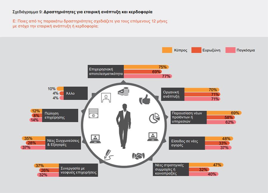 Σύμφωνα με την έρευνα της PwC Cyprus, h επιχειρησιακή αποτελεσματικότητα, η οργανική ανάπτυξη και η παρουσίαση νέων προϊόντων και υπηρεσιών είναι οι τρεις πρώτες δραστηριότητες που σχεδιάζουν για τους επόμενους 12 μήνες οι CEOs, με στόχο την εταιρική ανάπτυξη και την κερδοφορία. Η είσοδος σε νέες αγορές και οι στρατηγικές συμμαχίες και συνεργασίες, ακολουθούν στη λίστα των προτεραιοτήτων τους τόσο για τους επιχειρηματικούς ηγέτες στην Κύπρο όσο και για αυτούς στην Ευρωζώνη και παγκόσμια. Κατά το 2018 οι τρεις πρώτες δραστηριότητες των CEOs ήταν η οργανική ανάπτυξη, η μείωση του κόστους και οι νέες στρατηγικές συμμαχίες.