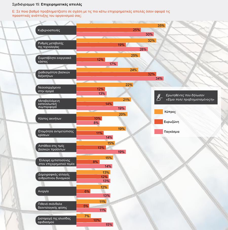 Όσον αφορά στις επιχειρηματικές απειλές, οι CEOs στην Κύπρο με 35% φαίνεται να επικεντρώνονται στις κυβερνοαπειλές και στη συνέχεια στο ρυθμό μεταβολής της τεχνολογίας με 32%, αναδεικνύοντας το θέμα της τεχνολογίας και το πως αυτή επηρεάζει είτε θετικά είτε αρνητικά μια επιχείρηση. Το ευμετάβλητο ενεργειακό κόστος αποτελεί την τρίτη σε σειρά επιχειρηματική απειλή για τους CEOs στη χώρα μας, αναδεικνύοντας το μεγάλο βαθμό προβληματισμού για τις επιχειρήσεις.
