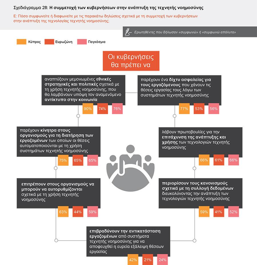 Η τεχνητή νοημοσύνη είναι ένας τρόπος για να είμαστε πιο αποτελεσματικοί, ταχύτεροι και να κάνουμε πράγματα με διαφορετικό τρόπο. Είναι ένα άλλο μεγάλο κεφάλαιο για τις επιχειρήσεις. Αυτήν την στιγμή αναπτύσσονται εφαρμογές τεχνητής νοημοσύνης που θα αναβαθμίσουν τον τεχνολογικό μετασχηματισμό των επιχειρήσεων, καθιστώντας την τεχνητή νοημοσύνη εργαλείο επιχειρηματικής ανάπτυξης. Το 80% των CEOs στην Κύπρο κι αντίστοιχα το 75% στην Ευρωζώνη και το 85% αυτών παγκόσμια, συμφωνούν ότι η τεχνολογία τεχνητής νοημοσύνης θα αλλάξει σημαντικά τον τρόπο διεξαγωγής των επιχειρηματικών δραστηριοτήτων τους στα επόμενα 5 έτη. Ωστόσο, οι CEOs στην Κύπρο έχουν υιοθετησει σε μικρό βαθμό (14%) πρωτοβουλίες σχετικές με συστήματα τεχνητής νοημοσύνης, σχεδιάζουν όμως (41%) τέτοιες πρωτοβουλίες μέσα στα επόμενα τρία έτη.
