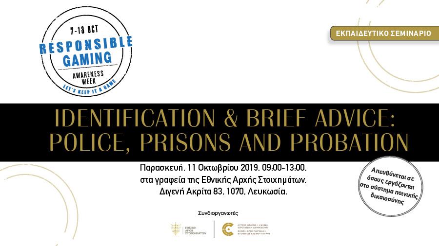 H Εθνική Αρχή Στοιχημάτων και η Εθνική Αρχή Παιγνίων και Εποπτείας Καζίνου Κύπρου, διοργανώνουν το εκπαιδευτικό σεμινάριο Identification & Brief Advice: Police, Prisons and Probation την Παρασκευή, 11 Οκτωβρίου 2019, 09:00-13:00, στα γραφεία της Εθνικής Αρχής Στοιχημάτων, Διγενή Ακρίτα 83, 1070, Λευκωσία, στο πλαίσιο της Εβδομάδας Ενημέρωσης Υπεύθυνου Παιχνιδιού 2019.