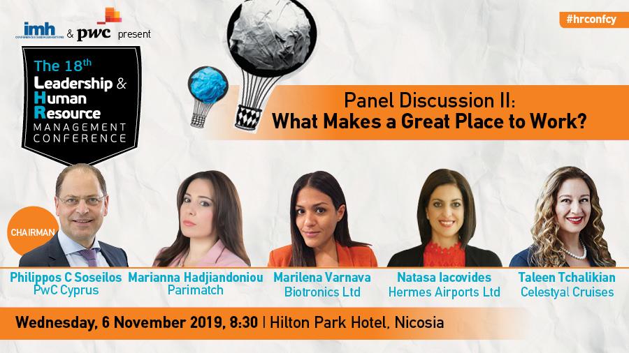 Μία σημαντική συζήτηση στρογγυλής τραπέζης από Διευθύντριες Ανθρώπινου Δυναμικού από διάφορους τομείς οικονομικής δραστηριοποίησης θα πραγματοποιηθεί στο πλαίσιο του “18th Leadership & HR Management Conference” που διοργανώνεται από την ΙΜΗ και την PwC Κύπρου, με κεντρικό θέμα: “What makes a Great Place to Work?”. Ραντεβού την Τετάρτη 6 Νοεμβρίου 2019 στο ξενοδοχείο Hilton Park, στη Λευκωσία.