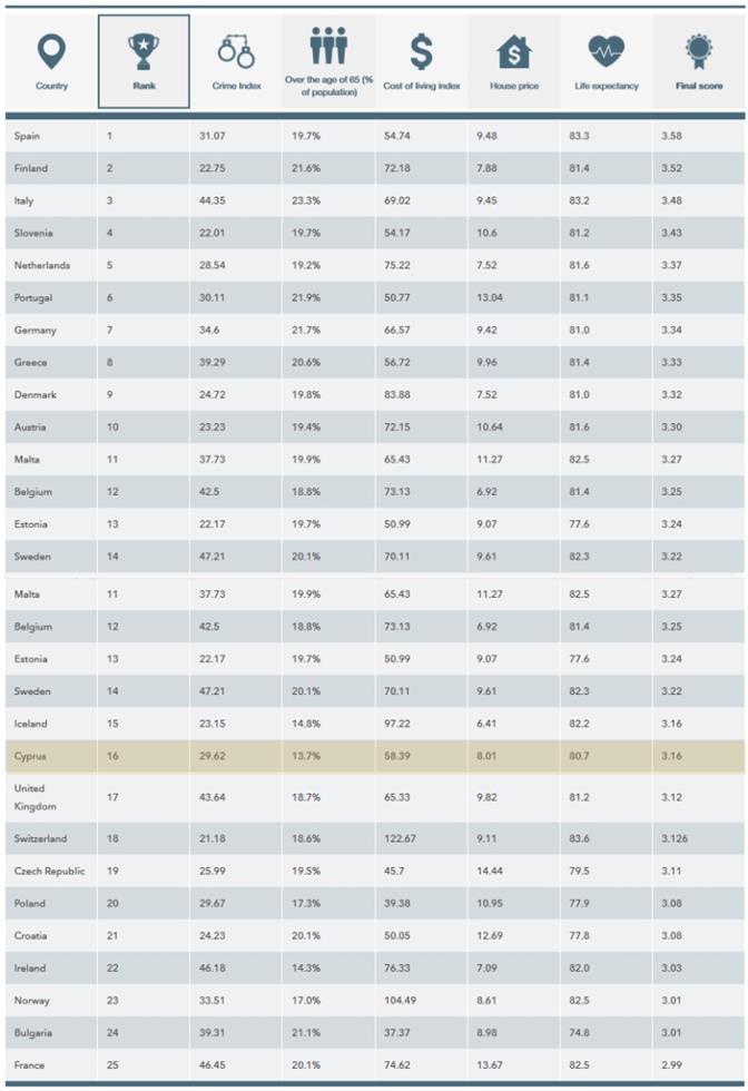 Η Κύπρος συγκεντρώνει 3,16 βαθμούς έναντι 3,58 της πρώτης Ισπανίας. Έχει αρκετά υψηλό προσδόκιμο όριο ζωής, ενώ πόντους της δίνουν επίσης ο καλός καιρός και η φυσική ομορφιά. Το κόστος ζωής δεν είναι στα πλεονεκτήματά της.