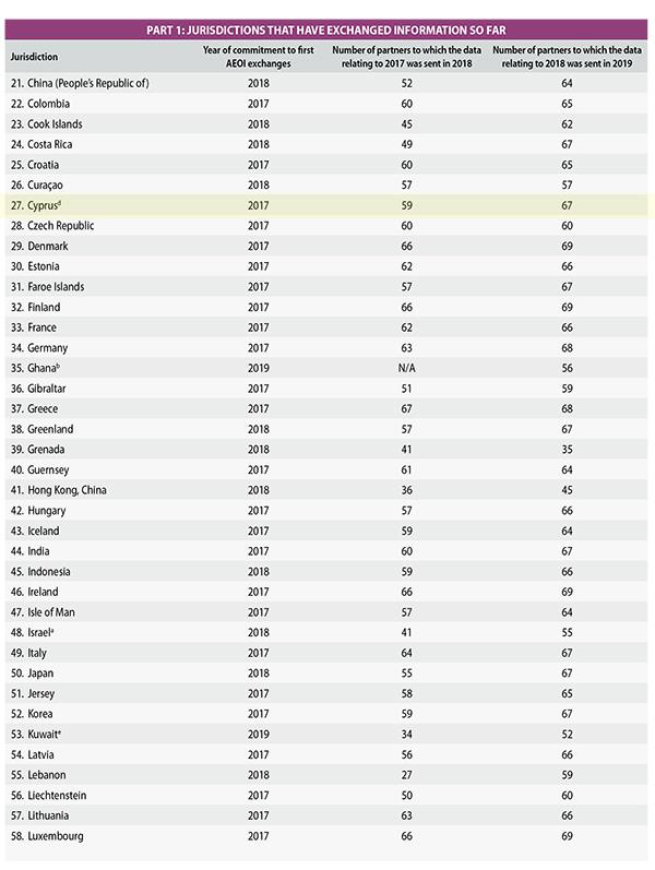 Σύμφωνα με την ίδια έκθεση, η Κύπρος έλαβε 241 αιτήσεις για ανταλλαγή πληροφοριών τραπεζικών λογαριασμών το 2009, ενώ για την περίοδο 2010-2018 έλαβε 5.487 αιτήσεις για ανταλλαγή πληροφοριών τραπεζικών λογαριασμών στην Κύπρο. Παράλληλα η Κύπρος χαρακτηρίζεται ως “largely compliant” σε ό,τι αφορά την εφαρμογή των προτύπων EOIR (Exchange of Information on Request) και AEOI (Automatic Exchange of Information).