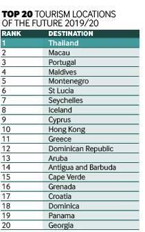 Με βάση τη λίστα του fDi, για τους «Τουριστικούς προορισμούς του μέλλοντος για την περίοδο 2019/ 2020», στην πρώτη θέση βρίσκεται η Ταϋλάνδη, η οποία συνεχίζει να αποτελεί τη μεγαλύτερη τουριστική οικονομία στην περιοχή της Νοτιοανατολικής Ασίας όσον αφορά την συμβολή του κλάδου στην τοπική οικονομία. Στην Ευρώπη, η πλέον ανερχόμενη αγορά είναι αυτή της Πορτογαλίας, η οποία καταλαμβάνει την τρίτη θέση, μετά το Μακάου που βρίσκεται στη δεύτερη θέση.