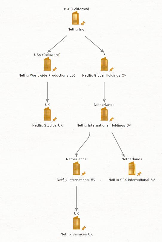 Το εντυπωσιακό είναι ο τρόπος με τον οποίο το Netflix, αλλά και όλα τα άλλα ψηφιακά μονοπώλια «εξαφανίζουν» τον τζίρο και τα κέρδη, χρησιμοποιώντας ένα δαίδαλο εταιρειών, με τις οποίες διοχετεύουν τα κέρδη σε εταιρείες οι οποίες εδρεύουν σε χώρες με ευνοϊκό φορολογικό καθεστώς, όπως εν προκειμένω η Ολλανδία.