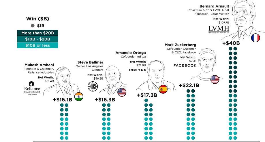 Πρώτος από τους κερδισμένους έρχεται ο Γάλλος Μπερνάρ Αρνό, πρόεδρος του ομίλου ειδών πολυτελείας LVMH. Ο τρίτος πλουσιότερος άνθρωπος στον πλανήτη, κέρδισε 40 δισ. δολάρια το 2019, με αποτέλεσμα να μπαίνει στη λίστα των ανθρώπων που έχουν περιουσία αξίας 12 μηδενικών. Το ποσό είναι τόσο μεγάλο που ο δεύτερος στη λίστα υπολείπεται περίπου για 18 δισ. δολάρια.