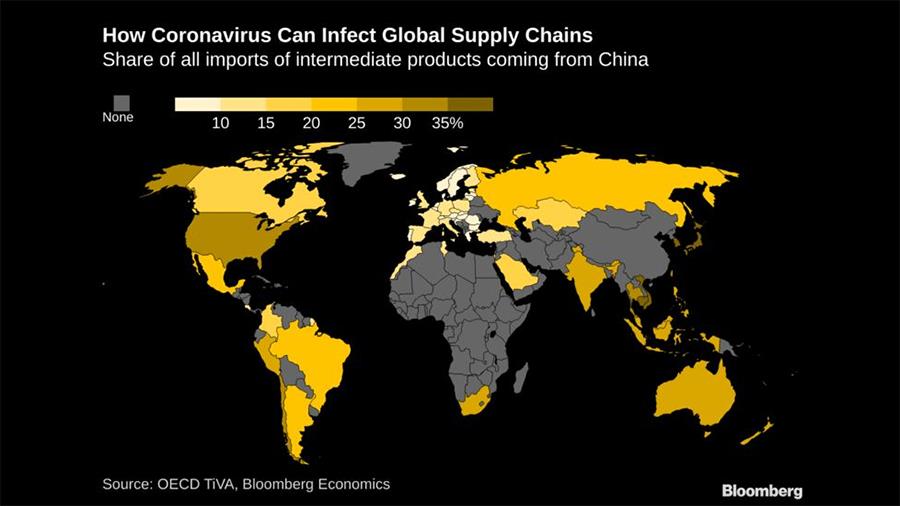 Περίπου το 20% των παγκόσμιων εισαγωγών αυτών των προϊόντων προήλθε από την Κίνα το 2015, σύμφωνα με τους υπολογισμούς του Bloomberg Economics με βάση τα εμπορικά δεδομένα του ΟΟΣΑ. Όσο περισσότερο ο κορωνοϊός περιορίζει τη βιομηχανική παραγωγή της Κίνας, τόσο μεγαλύτερος είναι ο κίνδυνος διακοπής στην παραγωγή εργοστασίων σε άλλα μέρη του κόσμου.
