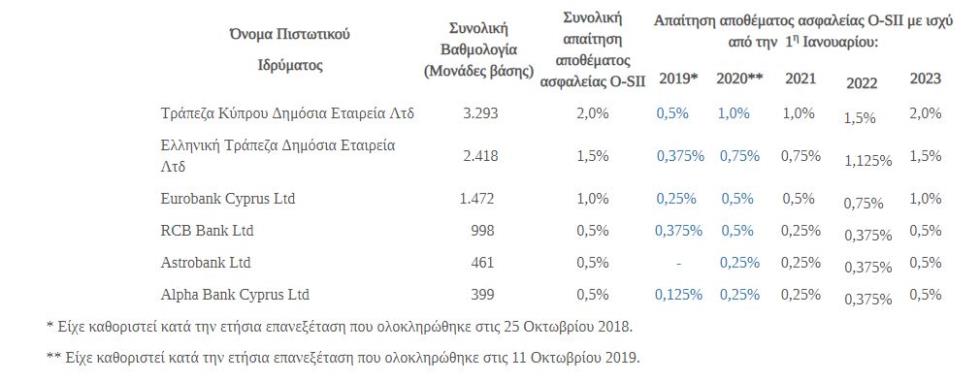 Η Κεντρική Τράπεζα της Κύπρου, ακολουθώντας την πολιτική της για τον προσδιορισμό των Άλλων Συστημικά Σημαντικών Ιδρυμάτων και την μεθοδολογία για τον καθορισμό της απαίτησης αποθέματος ασφαλείας O-SII του κάθε ιδρύματος, ολοκλήρωσε στις 7 Μαΐου 2020 την ετήσια επανεξέταση του προσδιορισμού των πιστωτικών ιδρυμάτων που εμπίπτουν στον ορισμό των ιδρυμάτων O-SII. Βάσει της επανεξέτασης της ΚΤΚ, έξι πιστωτικά ιδρύματα έχουν προσδιοριστεί ως ιδρύματα O-SII, τα οποία αναφέρονται στον πιο κάτω Πίνακα μαζί με το αντίστοιχο απόθεμα ασφαλείας O-SII που πρέπει να τηρούν.