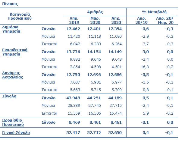 Σε σχέση με τον Απρίλιο του 2019 υπάρχει μείωση σε όλες τις κατηγορίες προσωπικού εκτός της Εκπαιδευτικής Υπηρεσίας, με τη μεγαλύτερη ποσοστιαία μείωση να παρατηρείται στο προσωπικό της Δημόσιας Υπηρεσίας (-0,6%) και πιο συγκεκριμένα στο μόνιμο προσωπικό με ποσοστό -2,9% (330 άτομα).