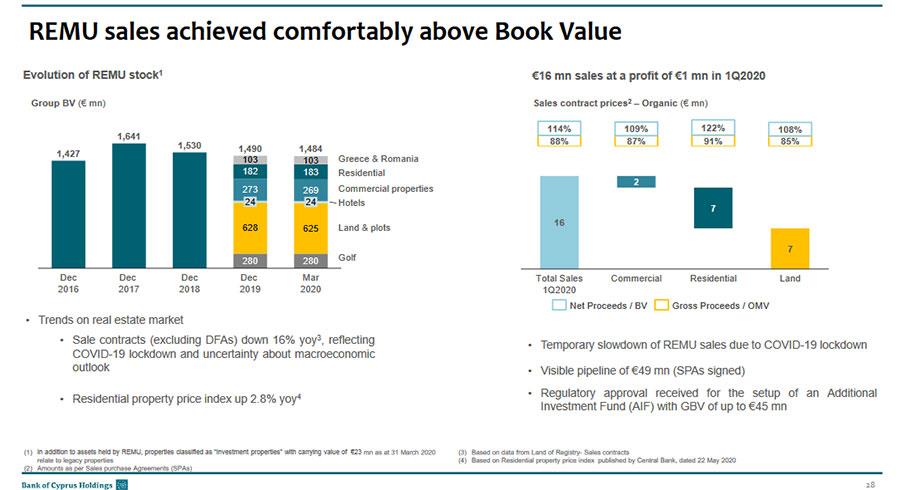 Κατά το πρώτο τρίμηνο του 2020 η REMU ανέλαβε ακίνητα ύψους €12 εκατ., ενώ το Συγκρότημα ολοκλήρωσε την οργανική πώληση ακινήτων ύψους €14 εκατ. καταγράφοντας κέρδη από την πώληση ακινήτων ύψους €1 εκατ. για το α’ τρίμηνο 2020.