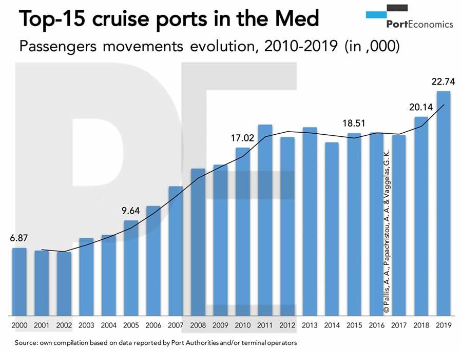 “Στο ξεκίνημα της 2ης 10ετίας του 21ου αιώνα τα ΤΟΡ 15 λιμάνια κρουαζιέρας της Μεσογείου εξυπηρετούσαν 17 εκατομμύρια επιβάτες που ήταν τριπλάσιος αριθμός σε σύγκριση με το 2000” επισημάνει ο Θάνος Πάλλης καθηγητής του Πανεπιστημίου Αιγαίου και πρόεδρος της Διεθνούς Ένωσης Ναυτιλιακών Οικονομολόγων: “ Στο τέλος του 2019 οι αριθμοί αυτοί δείχνουν μέτριοι. Ακόμη και η αύξηση κατά 34% του λιμανιού της Μπαρτσελόνα από το 2010 δεν εντυπωσιάζει όσο η αύξηση κατά 72% των Βαλεαρίδων Νήσων μέσα σε μία 10ετία , το 83% της Βαλέτα και 167% της Μασσαλίας” και προσθέτει: