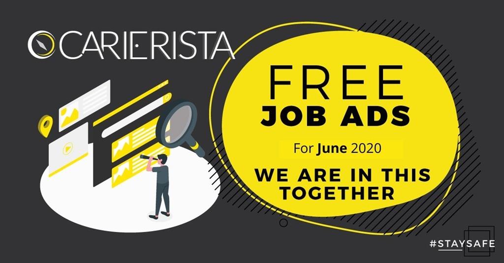 Το Carierista.com, γνωρίζοντας τις δυσκολίες που περνά η κάθε επιχείρηση αυτές τις πρωτόγνωρες για όλους μέρες, αποφασίσαμε να επεκτείνουμε για ακόμα ένα μήνα τις δωρεάν αγγελίες για όλες τις εταιρείες. Για όλο λοιπόν τον μήνα Ιούνιο 2020 δε θα υπάρχει καμιά χρέωση για τις αγγελίες που θα δημοσιεύονται στην ιστοσελίδα μας.