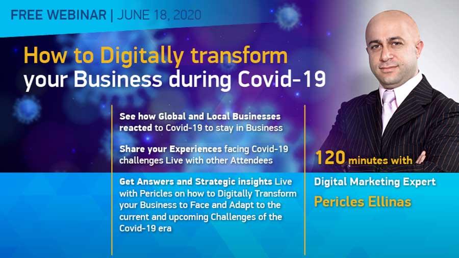 Το UK Webinar onHow to Digitally Transform your Business during Covid -19’ αγκαλιάστηκε από την αρχή από τους επαγγελματίες του χώρου σε Ηνωμένο Βασίλειο και Κύπρο φιλοξενώντας συμμετέχοντες και από τις δυο κοινότητες προερχόμενοι από τον χώρο των Συμβουλευτικών, Λογιστικών, Νομικών και Τραπεζικών Υπηρεσιών, όπως και των Τηλεπικοινωνιών, του Ηλεκτρονικού  Εμπορίου,  του Ψηφιακού Μάρκετινγκ, Εταιριών Ανεύρεσης και Εκπαίδευσης ταλέντων κ.α.