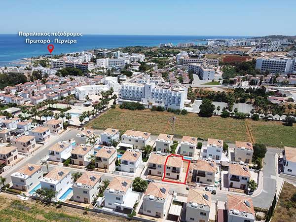 Διώροφη εξοχική κατοικία τριών υπνοδωματίων με ιδιωτικό χώρο στάθμευσης. Με εσωτερικό χώρο περί τα 130 τ.μ. μαζί με καλ. βεράντα 6 τ.μ. και ακάλυπτες βεράντες 26 τ.μ. Το κατάλυμα βρίσκεται στην περιοχή Περνέρα στον Πρωταρά. Η εξοχική κατοικία είναι μέρος ενός συγκροτήματος 27 σπιτιών, το οποίο εφάπτεται της λεωφόρου Περνέρα και βρίσκεται περίπου 400 μ. από την παραλία και περίπου 2 χιλιόμετρα από την περιοχή του Πρωταρά. Η άμεση περιοχή του ακινήτου χαρακτηρίζεται κυρίως από οικιστικές μονάδες όπως κατοικίες και συγκροτήματα διαμερισμάτων.