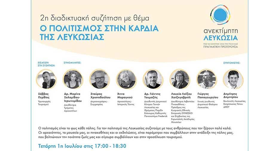 H πρωτοβουλία «Ανεκτίμητη Λευκωσία» διοργανώνει την 2η διαδικτυακή συνάντηση με θέμα «Ο πολιτισμός στην Καρδιά της Λευκωσίας», την Τετάρτη 1η Ιουλίου στις 17:00. Η πρωτοβουλία, που στόχο έχει να ενισχύσει τις προσπάθειες για να κάνουμε ξανά την πόλη μας πραγματική Πρωτεύουσα, συνεχίζει τις διαδικτυακές συναντήσεις αγγίζοντας ένα ζήτημα που έχει να κάνει με την ανάδειξη της ιστορίας μας και του πολιτισμού της πόλης μας. Πως ενισχύουμε τη Λευκωσία μέσα από τις αρχαιότητες, την ιστορία μας και τις πολιτιστικές εκδηλώσεις; Πως βελτιώνουν την ποιότητα της ζωής μας και πως ενισχύουν τον τουρισμό στην πρωτεύουσα.