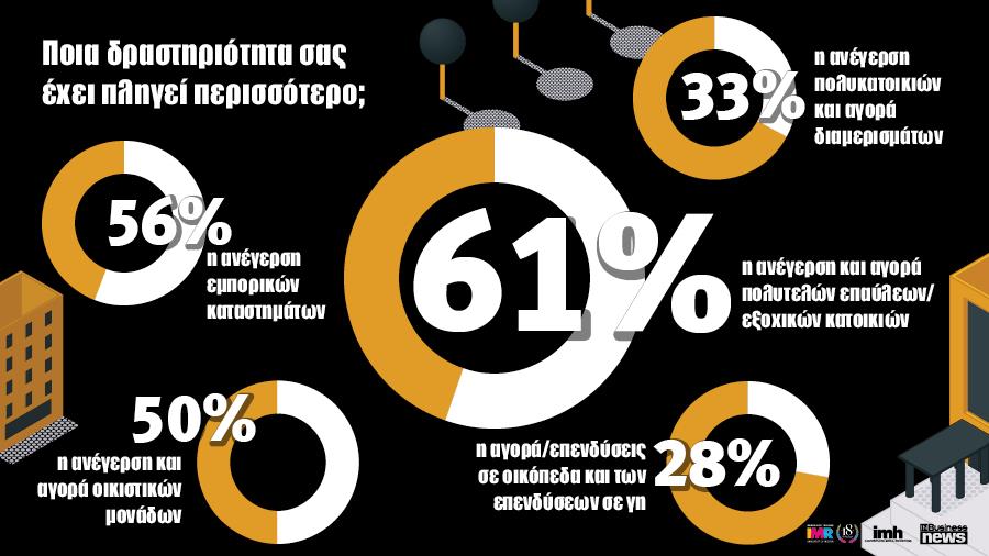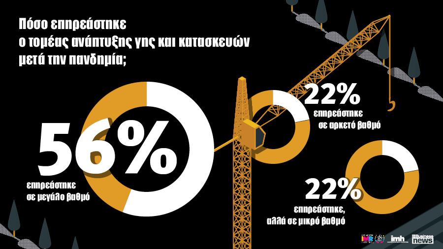 Η πανδημία φαίνεται να έπληξε σχεδόν το σύνολο των δραστηριοτήτων του τομέα της ανάπτυξης γης και των κατασκευών, με έξι στους δέκα CEOs (61%) να δηλώνουν πως η ανέγερση και αγορά πολυτελών επαύλεων/εξοχικών κατοικιών είναι η δραστηριότητα εκείνη που πλήγηκε ή θα εκτιμούν πως θα πληγεί περισσότερο. Η ανέγερση εμπορικών καταστημάτων αποτελεί δραστηριότητα που φαίνεται να πλήττεται εξίσου, καθότι σε αυτή διαπιστώνει τις περισσότερες επιπτώσεις το 56% των CEOs, ενώ περίπου στα ίδια επίπεδα βρίσκονται και οι διαπιστωνόμενες ή προβλεπόμενες συνέπειες σε σχέση με την ανέγερση και αγορά οικιστικών μονάδων(50%). Κάπως μικρότερες δείχνει ή αναμένεται να είναι, σύμφωνα με τις εκτιμήσεις των CEOs, το πλήγμα σε ό,τι αφορά την ανέγερση πολυκατοικιών και αγορά διαμερισμάτων(33%), καθώς και σε ό,τι αφορά την αγορά/επενδύσεις σε οικόπεδα και των επενδύσεων σε γη (28%).