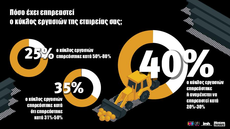 Το μέγεθος του πλήγματος που έχει δεχθεί ο κλάδος αποτυπώνεται εξίσου ευκρινώς στο μέγεθος επηρεασμού του κύκλου εργασιών των εταιρειών. Το 25% των CEOs, αναφέρουν πως ο κύκλος εργασιών των εταιρειών τους επηρεάστηκε κατά 50%-80%, ενώ το 35% ότι επηρεάστηκε κατά 31%-50%. Τέσσερις στους δέκα CEOs, αναφέρουν πως ο κύκλος εργασιών των δικών τους εταιρειών επηρεάστηκε ή αναμένεται να επηρεαστεί κατά 20%-30%.