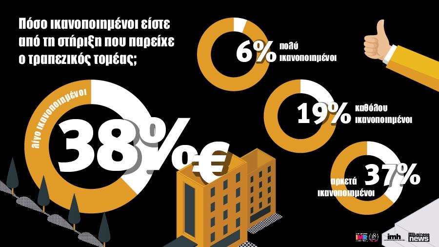 Οι CEOs των εταιρειών που δραστηριοποιούνται στον τομέα της ανάπτυξης και των κατασκευών, θα ανέμεναν μεγαλύτερη στήριξη από τον τραπεζικό τομέα, και συγκεκριμένα από τα χρηματοπιστωτικά ιδρύματα με τα οποία συνεργάζονται. Το συμπέρασμα αυτό προκύπτει από το γεγονός ότι μόνο το 25% από αυτούς εμφανίζεται πολύ ή αρκετά (19%) ικανοποιημένο από τις διευκολύνσεις των οποίων τυγχάνει από τις τράπεζες. Αντιθέτως, περισσότεροι από επτά στους δέκα, αναφέρουν πως είναι λίγο (38%) ή καθόλου (37%) ικανοποιημένοι.