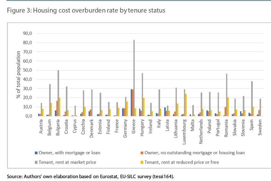 Σύμφωνα με την ίδια μελέτη, περισσότερο από το 40% του μηνιαίου εισοδήματος δαπανούν για στέγαση και τρία στα δέκα ελληνικά νοικοκυριά που μένουν σε δικό τους σπίτι χωρίς να έχουν εξοφλήσει ακόμα το στεγαστικό δάνειό τους. Πρόκειται για ποσοστό νοικοκυριών που είναι τριπλάσιο από τα περισσότερο κράτη – μέλη της Ε.Ε. Ακόμα και οι ιδιοκτήτες κατοικιών στη χώρα μας επιβαρύνονται πολύ περισσότερο για δαπάνες στέγασης (φόροι ακινήτων, λογαριασμοί ΔΕΚΟ, κ.α.) σε σχέση με τον μέσο όρο της Ε.Ε. Για λόγους σύγκρισης, μεταξύ 2010 και 2018 το ποσοστό των νοικοκυριών στην Ε.Ε. που δαπανά πάνω από το 40% του διαθέσιμου εισοδήματος για στέγαση (ανεξάρτητα από το εάν πληρώνουν ενοίκιο ή στεγαστικό ή έχουν δικό τους σπίτι) παρέμεινε σταθερό στο 10%, δηλαδή σε πολύ χαμηλότερα επίπεδα από την Ελλάδα.