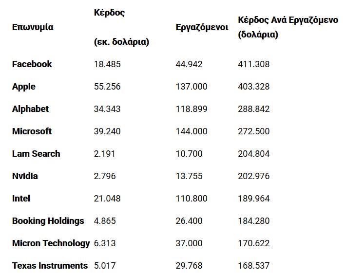 Όπως θα περίμενε κάποιος, οι πιο κερδοφόρες εταιρείες, όπως το Facebook και η Apple, έχουν τα υψηλότερα κέρδη ανά εργαζόμενο. Το κέρδος ανά εργαζόμενο του Facebook, για παράδειγμα, είναι ασύλληπτο: 411.308 δολάρια. Αντίστοιχα, το κέρδος ανά εργαζόμενο για την Apple είναι ελάχιστα χαμηλότερο, στα 403.328 δολάρια.