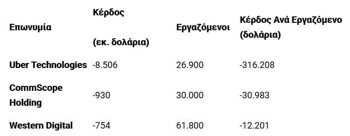 Δεν προκαλεί φυσικά εντύπωση που η Uber, η οποία πάντα ήταν ζημιογόνα, βρίσκεται στην κορυφή της λίστας με μείον 316.208 δολάρια κέρδος ανά εργαζόμενο.