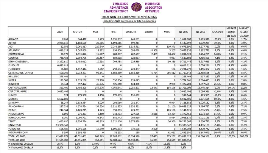 Συγκεκριμένα, σύμφωνα με τα προκαταρκτικά στοιχεία του Συνδέσμου Ασφαλιστικών Εταιρειών Κύπρου(ΣΑΕΚ), το σύνολο των μικτών ασφαλίστρων (συμπεριλαμβανομένων ασφαλίστρων ατυχημάτων και υγείας από εταιρείες Ζωής) των ασφαλιστικών εταιρειών Γενικού Κλάδου ανήλθαν στα €135,88 εκατ. το πρώτο τρίμηνο του 2020 παρουσιάζοντας αύξηση 3,7% σε σχέση με την αντίστοιχη περίοδο του 2019, ενώ το σύνολο των μικτών ασφαλίστρων – (μη συμπεριλαμβανομένων ασφαλίστρων ατυχημάτων και υγείας από εταιρείες Ζωής) των ασφαλιστικών εταιρειών Κλάδου Ζωής ανήλθαν στα €113,6 εκατ. το πρώτο τρίμηνο του 2020 καταγράφοντας αύξηση 4,4% σε σχέση με την αντίστοιχη περίοδο του 2019.