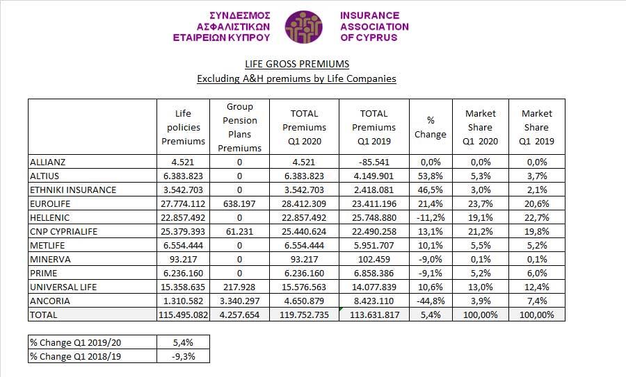 Το μεγαλύτερο μερίδιο αγοράς στα μικτά ασφάλιστρα Κλάδου Ζωής (μη συμπεριλαμβανομένων ασφαλίστρων ατυχημάτων και υγείας από εταιρείες Ζωής) κατά το πρώτο τρίμηνο του 2020 κατείχε η Eurolife με ποσοστό 23,7%, με την CNP Cyprialife να ακολουθεί με ποσοστό 21,2% και την Hellenic να βρίσκεται στην τρίτη θέση με ποσοστό 19,1%.