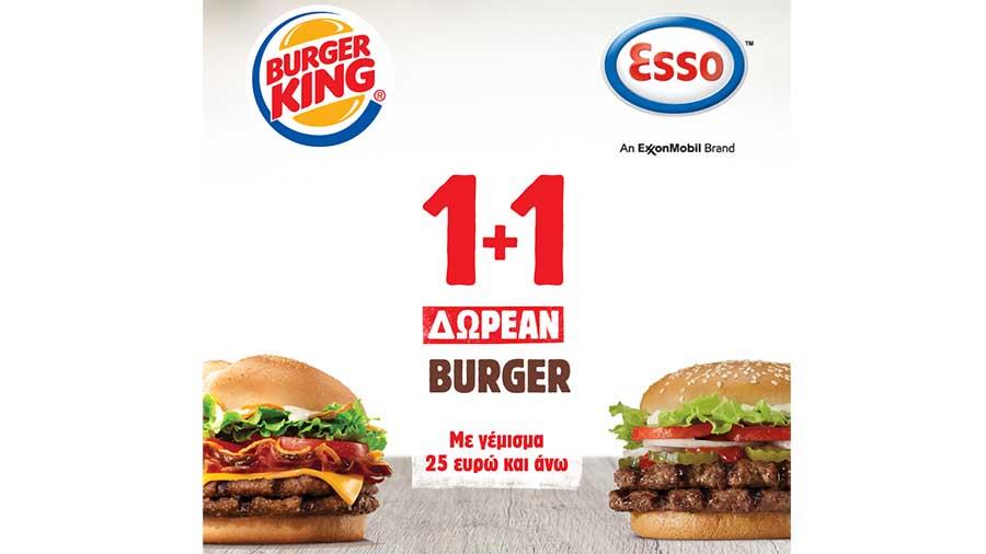 Γεμίζοντας το αυτοκίνητο με καύσιμα αξίας 25 ευρώ και άνω στην Esso, θα προσφέρεται κουπόνι για 1+1 δωρεάν burger από τα Burger King! Η προσφορά ισχύει για όλα τα burgers της γνωστής αλυσίδας εστιατορίων και το κουπόνι μπορεί να εξαργυρωθεί σε dine in, take away ή τηλεφωνικά στο 77 77 72 72.