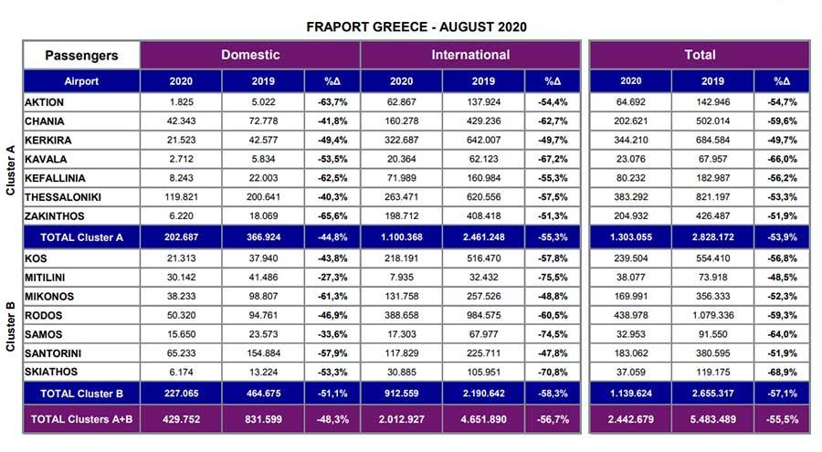Συνολικά στα αεροδρόμια που διαχειρίζεται η Fraport η πτώση της επιβατικής κίνησης για τον πιο κρίσιμο μήνα της σεζόν ήταν στο 55,5% στα 2,44 εκατ. επιβάτες από 5,48 εκατ. επιβάτες τον αντίστοιχο περυσινό μήνα. Ανά εθνικότητα, οι αφίξεις από Βρετανία άγγιξαν στις 316.000 στα 14 περιφερειακά αεροδρόμια, με δεύτερους τους Γερμανούς με σχεδόν 206.000 αφίξεις, ακολουθούν οι Πολωνοί με ένα νούμερο λίγο κάτω από τις 82.000 αφίξεις μέσα στον Αύγουστο και έπονται οι Ιταλοί και οι Ολλανδοί με 70.500 και 52.300 αφίξεις αντίστοιχα.