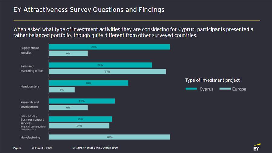 Οι τομές στους οποίους οι επενδυτές σχεδιάζουν να επενδύσουν, το 28% ανέφεραν τις αλυσίδες εφοδιασμού και τα logistics, το 24% τα γραφεία πωλήσεων και μάρκετινγκ, και το 18% τα κεντρικά γραφεία επιχειρήσεων. Όσον αφορά τις απόψεις τους για τους επιχειρηματικούς τομείς που θα οδηγήσουν την ανάπτυξη στην Κύπρο τα επόμενα χρόνια, οι ερωτηθέντες ανέφεραν τον τουρισμό (48%), ακολούθησαν οι χρηματοοικονομικές υπηρεσίες και οι επαγγελματικές υπηρεσίες με 21% η κάθε μια, ακολουθούμενες από τα ακίνητα και τις κατασκευές (18%).