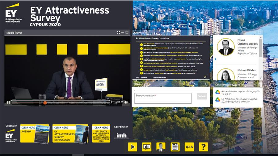 Οι παράγοντες και ποιοτικά χαρακτηριστικά που καθιστούν την Κύπρο ελκυστικό επενδυτικό προορισμό, οι πολιτικές καθώς και τους τομείς της Οικονομίας στους οποίους οι ξένοι επενδυτές διαβλέπουν προοπτικές για ανάπτυξη στο μέλλον, αναλύθηκαν στην διαδικτυακή εκδήλωση που διοργάνωσε με απόλυτη επιτυχία η ΕΥ Κύπρου με τίτλο ΕY Attractiveness Survey Cyprus 2020, την οποία παρακολούθησαν πέραν των 250 συμμετεχόντων.