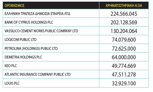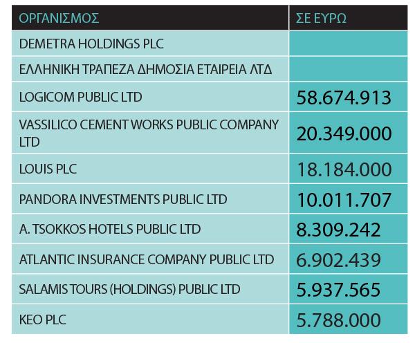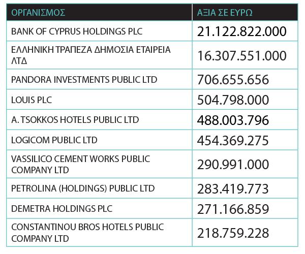 Αν εξαιρέσουμε τις δύο συστημικές τράπεζες, ψηλά στη λίστα των εισηγμένων με περιουσιακά στοιχεία μεγάλης αξίας εντοπίζουμε εταιρείες, οι οποίες δραστηριοποιούνται στη ξενοδοχειακή βιομηχανία, στην ανάπτυξη γης, στο εμπόριο, στην τεχνολογία, στην παραγωγή, αλλά και στις επενδύσεις. Αξίζει να σημειωθεί πως δεν συμπεριλήφθηκε η Cyprus Trading Corporation καθώς τα τελευταία στοιχεία που δημοσιοποίησε αφορούσαν το 2017. Λόγω της μεγάλης αναδιάρθρωσης του ομίλου CTC που βρισκόταν σε εξέλιξη τα προηγούμενα χρόνια, ενδεχομένως, πλέον, τα περιουσιακά του στοιχεία να έχουν μειωθεί σημαντικά, όπως βεβαίως και οι υποχρεώσεις του.