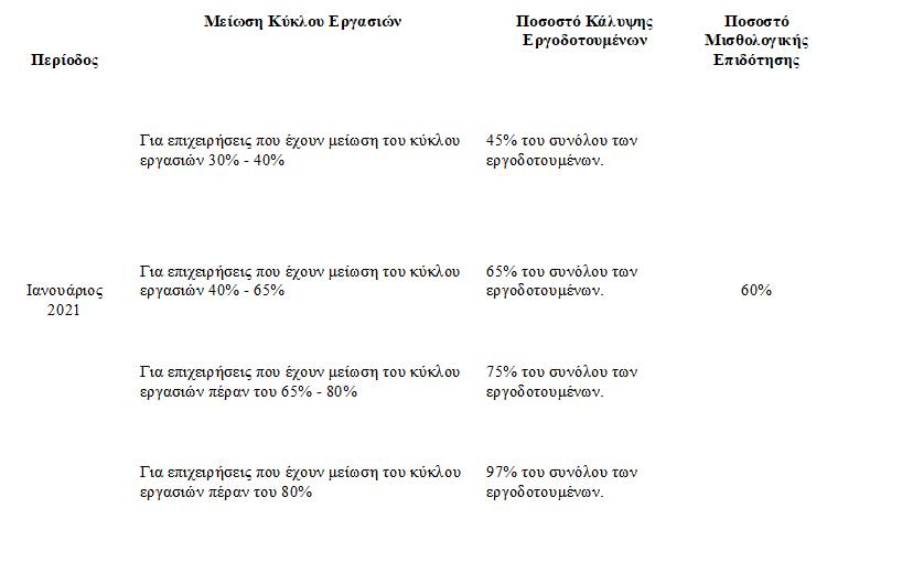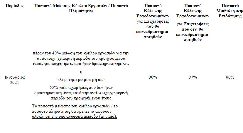 iii. εφόσον έχουν ή προβλέπουν μείωση του κύκλου εργασιών τους πέραν του 40%, ή του 80% για όσους ασκούν οικονομική δραστηριότητα που εμπίπτει στο σημείο (11) πιο πάνω, για την περίοδο από την 1η Ιανουαρίου 2021 μέχρι και την 31η Ιανουαρίου 2021 ή από τη 10η μέχρι την 31η Ιανουαρίου 2021 σε σύγκριση με την αντίστοιχη περίοδο του προηγούμενου έτους και η μείωση του κύκλου εργασιών τους οφείλεται αποκλειστικά στην κατάσταση που περιήλθε η επιχείρηση τους λόγω της πανδημίας του κορωνοϊού COVID 19. Σε περίπτωση που δεν απασχολούνταν ως αυτοτελώς εργαζόμενοι κατά το προηγούμενο έτος, τότε η σύγκριση θα γίνει με περίοδο που προηγείται της 1ης Ιανουαρίου 2021 μη λαμβανομένης υπ’ όψη οποιασδήποτε μείωσης του κύκλου εργασιών για την περίοδο από 16 Μαρτίου 2020 μέχρι και 31 Δεκεμβρίου 2020.