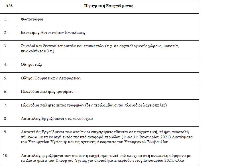 Νοείται ότι για τους αυτοτελώς εργαζόμενους που εντάσσονται στην κατηγορία (10) πιο πάνω, η μείωση του κύκλου εργασιών θα αφορά την περίοδο κατά την οποία σύμφωνα με τα Διατάγματα του Υπουργείου Υγείας τελούσαν υπό υποχρεωτική αναστολή για την περίοδο Ιανουαρίου 2021, σε σχέση με την αντίστοιχη περίοδο του προηγούμενου έτους.