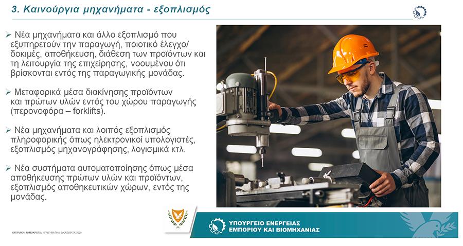 Παρουσιάζοντας το σχέδιο κατά τη διάρκεια διαδικτυακής ενημερωτικής ημερίδας που πραγματοποιήθηκε σήμερα, ο Διευθυντής της Υπηρεσίας Βιομηχανίας και Τεχνολογίας του Υπουργείου Ενέργειας, Εμπορίου και Βιομηχανίας Χρίστος Φωτιάδης, υπέδειξε πως ειδικότεροι στόχοι του είναι η ενίσχυση επιχειρήσεων για την υλοποίηση επενδύσεων που θα βελτιώσουν την τεχνολογική στάθμη, την παραγωγική διαδικασία και την παραγωγικότητά τους, η δημιουργία νέων μονάδων και η τόνωση της επιχειρηματικότητας, καθώς και η δημιουργία νέων θέσεων εργασίας.